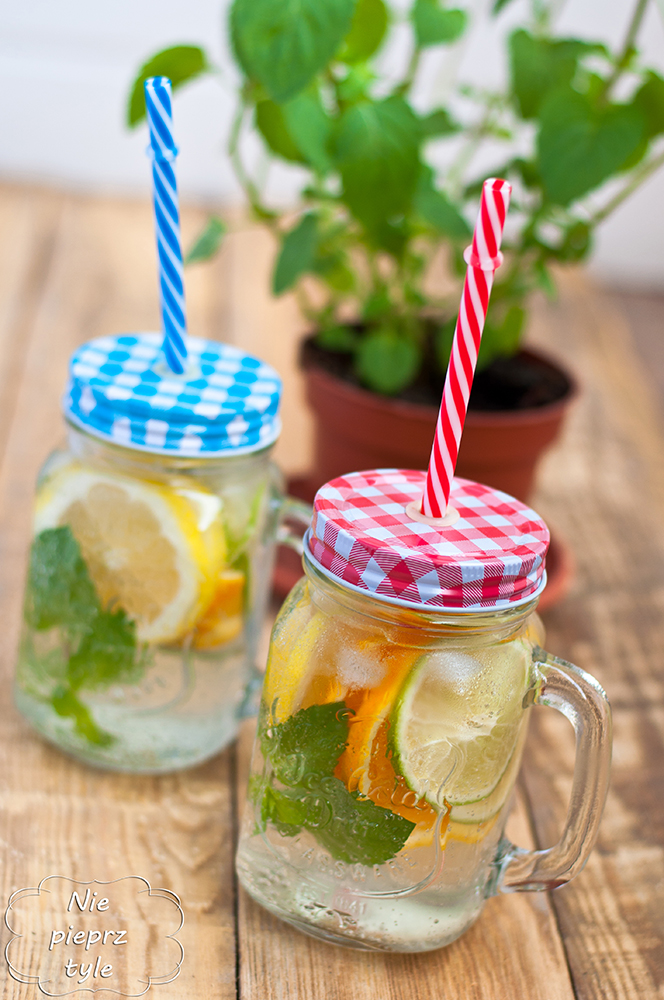 Wypełnij słoiczek do połowy schłodzoną w lodówce wodą. Cytrusy sparz wrzątkiem lub wyczyść przy użyciu sody oczyszczonej. Wkrój do słoiczka po 2 plastry cytryny, pomarańczy i limonki. Dodaj gałązkę mięty. Wrzuć kostki lodu, a następnie dolej wody w razie potrzeby. Dla uzyskania kwaśniejszego smaku wyciśniej trochę cytryny do napoju.
