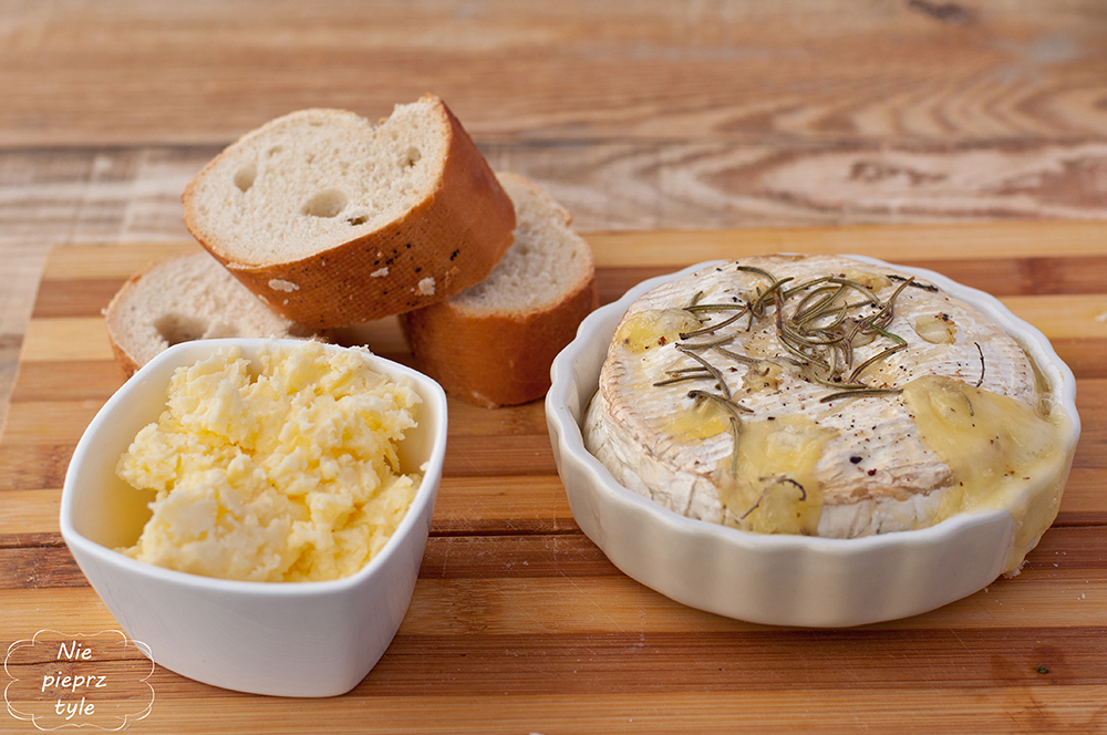 Wyjmij ser z opakowania i włóż najlepiej do naczynia przeznaczonego na creme brulee. Ząbek czosnku obierz z łupinki pokrój na mniejsze kawałki i powbijaj je w ser. Całość posyp rozmarynem. Rozgrzej piekarnik do 180 stopni Celsjusza i zapiekaj ser przez 10 min. Camembert musi zacząć się widocznie wytapiać, wtedy jest gotowy. Najlepiej podawać z bagietką lub grzankami. Nabieraj ser bezpośrednio na chleb lub rozsmarowuj nożem. My dodatkowo dodaliśmy masełko czosnkowe.