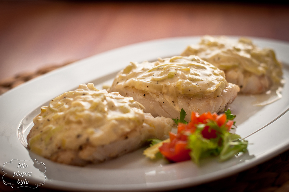 Ewentualnie usmaż rybę na patelni. Gdy ryba będzie gotowa wyłóż ją na talerz i przykryj porową pierzynką.
