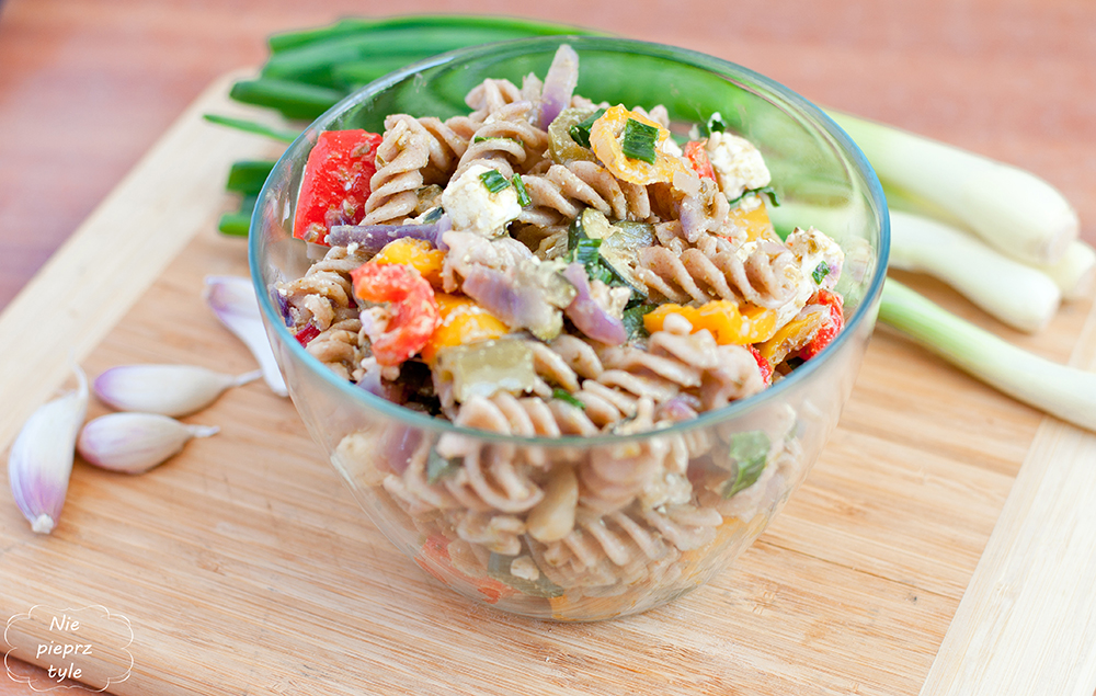 Makaron ugotuj al dente. Wystudź i przerzuć do miski. Papryki oczyść z gniazd nasiennych i pokrój w grubą kostkę. Wrzuć do drugiej miski, posól, popieprz i polej oliwą. Następnie dokładnie wymieszaj. Paprykę duś na patelni lub podpiecz w piekarniku w temperaturze 180 stopni Celsjusza przez 15-20 minut. W tym czasie poszatkuj szczypior pokrój w kostkę cebulę. Wrzuć wszystkie warzywa do makaronu. Dodaj pokruszony lub pokrojony w większą kostkę ser feta. Jeśli jest potrzeba dopraw sałatkę do smaku solą i pieprzem. Na koniec dodaj bazyliowe pesto i dokładnie wymieszaj.