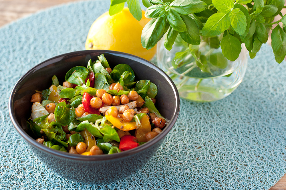 Okres lata jest idealny na sałatki. Gdy na targu można kupić miks papryk często pojawiają się u nas na stole. Tym razem w połączeniu z ciecierzycą. Muszę przyznać, że odkąd po raz pierwszy przygotowałam tą sałatkę Mąż upomina się o nią dość często. 😉
