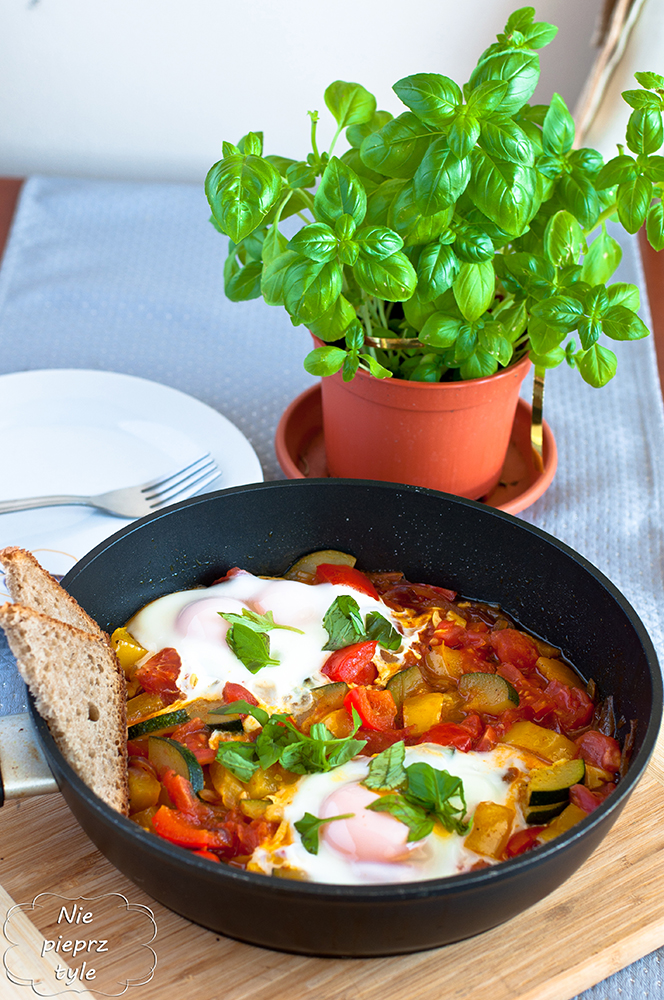 Papryki podziel na połówki, wydrąż gniazda nasienne i dokładnie umyj. Następnie pokrój w niezbyt dużą kostkę. Cukinię umyj i pokrój na ćwiartki. Cebulę poszatkuj. Rozgrzej na patelni olej lub masło, wrzuć cebulę i zeszklij ją. Dorzuć do cebuli paprykę i cukinię. Duś do momentu, aż warzywa będą miękkie. Dopraw solą, pieprzem, papryką. Dodaj zioła. Pomidora sparz wrzątkiem, obierz ze skóry, pokrój w kostkę i dorzuć do warzyw. Duś nadal, aż pomidory puszczą sok. Dodaj posiekany lub wyciśnięty przez praskę czosnek. Na wierzch warzyw wbij jajka. Przykryj pokrywką i duś do momentu, aż białko jajka całkowici się zetnie. Przed podaniem posyp poszatkowanym szczypiorem lub świeżą bazylią.
