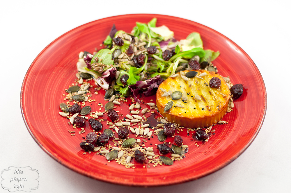 Sałatę umyj i połóż na talerzu. Pestki dyni, ziarna słonecznika, sezam i siemię lniane praż kilka minut na suchej patelni. Oscypek grilluj na patelni grillowej do momentu pojawienia się widocznych przypieczonych linii. Ser połóż obok sałatki. Posyp wszystko uprażonymi nasionami, żurawiną i czarnuszką. Na koniec polej przyrządzonym sosem. Smakuje, że Hej!