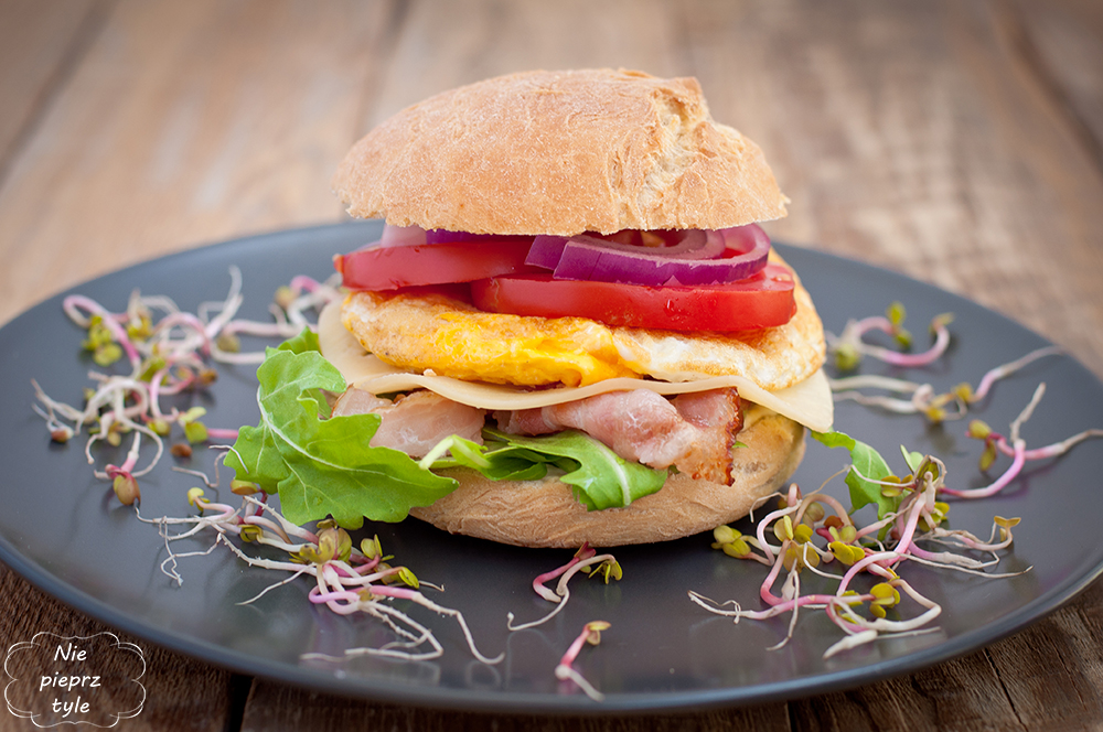 Bułkę przekrój na pół. Posmaruj cienką warstwą masła. Składniki układaj na płaskiej połówce pieczywa według dowolnej kolejności. My proponujemy następującą: rukola, boczek, ser żółty, jajko sadzone, plastry pomidora, cebula. Następnie przykryj drugą połówką bułki.