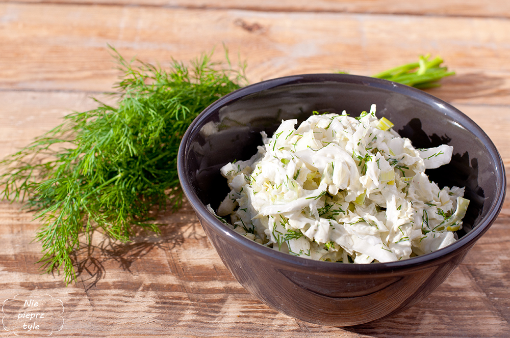 Kapustę pekińską poszatkuj i przełóż do miski. Dodaj posiekany koperek, chrzan, majonez lub jogurt, a następnie dopraw do smaku solą i pieprzem. Dokładnie wymieszaj. Surówka będzie dobrze komponować się z każdym rodzajem mięsa oraz rybą.