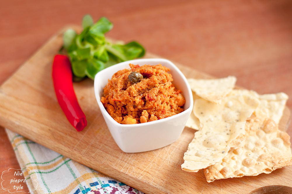 - Ciecierzycę przerzuć do miski, dodaj pokrojone w mniejsze części suszone pomidory i poszatkowaną chilli. Dopraw odrobiną soli. Dolej wodę i oliwę z suszonych pomidorów. Wszystko zmiksuj blenderem. Jeśli pasta będzie zbyt sucha dodaj jeszcze trochę wody. Pasta nie musi być zmiksowania idealnie na gładką masę.