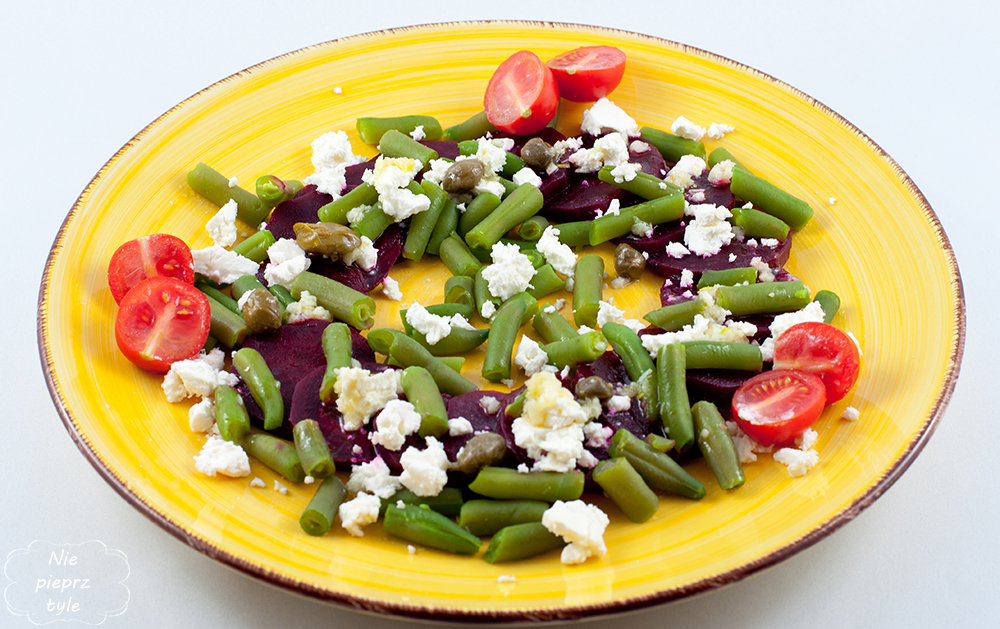 - Ugotowanego i pokrojonego w plastry buraka wyłóż na talerz, obsyp fasolką i serem feta. Polej przygotowanym sosem.