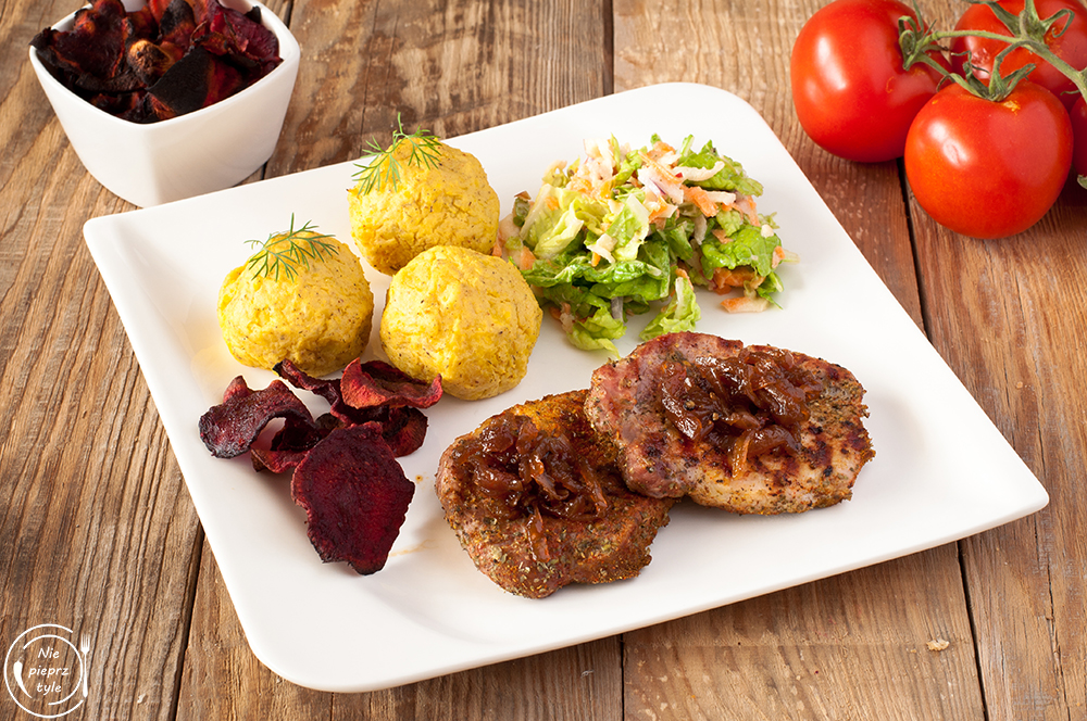 - Międzyczasie przygotuj konfiturę z cebuli, zapiekane kulki ziemniaczane, surówkę z kapusty pekińskiej z jogurtem oraz opcjonalnie chipsy z buraka.