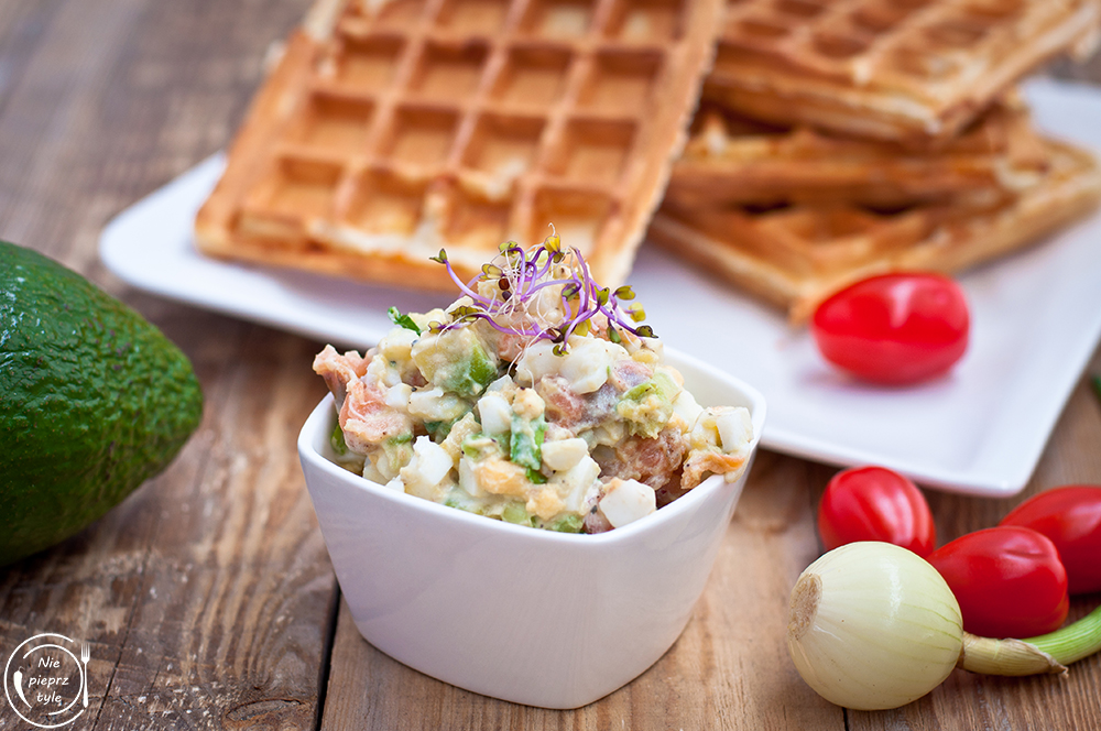 - Łososia pokrój na mniejsze części. Dodaj do awokado i jajek. Przypraw solą i pieprzem. Dodaj jogurt i całość dokładnie wymieszaj.