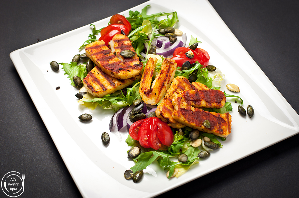 Marek wymyślił, żeby wysmarować halloumi pastą harissa. No i jest. Sałatka z grillowanym halloumi harissa.