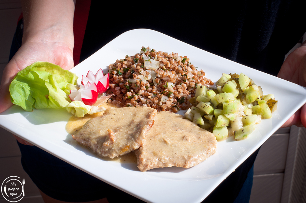 - Podawaj tradycyjnie na talerzu: kasza, kawałki schabu z sosem i sałatka z ogórków.