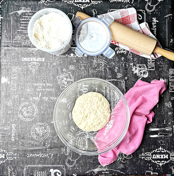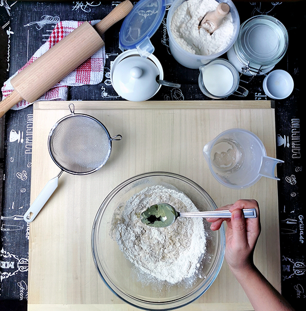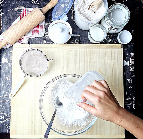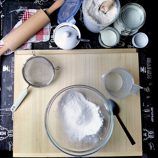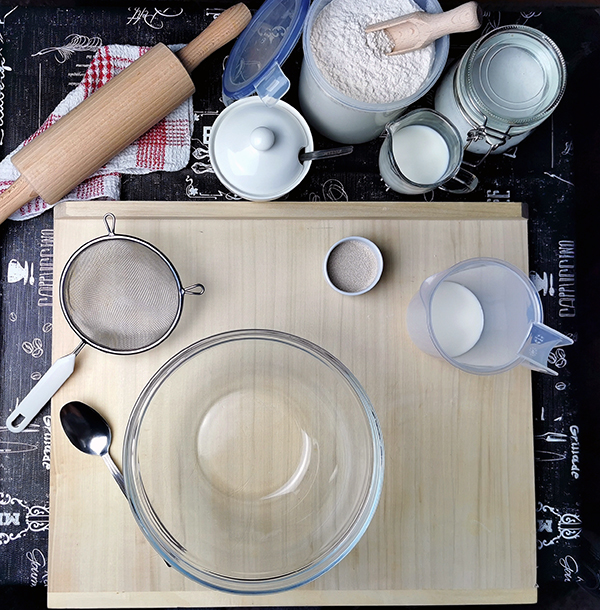 - 175 g przesianej mąki pszennej + dodatkowe 50 g na podsypywanie (typ 480 lub 500)