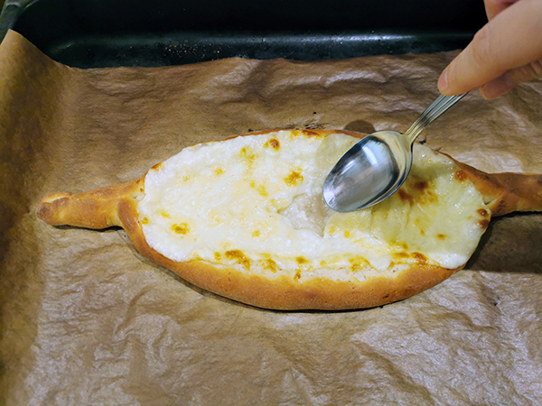 11. Następnie wyjmij chaczapuri i łyżką zrób niewielkie wgłębienie na środku placka. Rozdziel białko od żółtka i przełóż żółtko do wgłębienia. Włóż ponownie do piekarnika i zapiekaj 1-2 minuty.