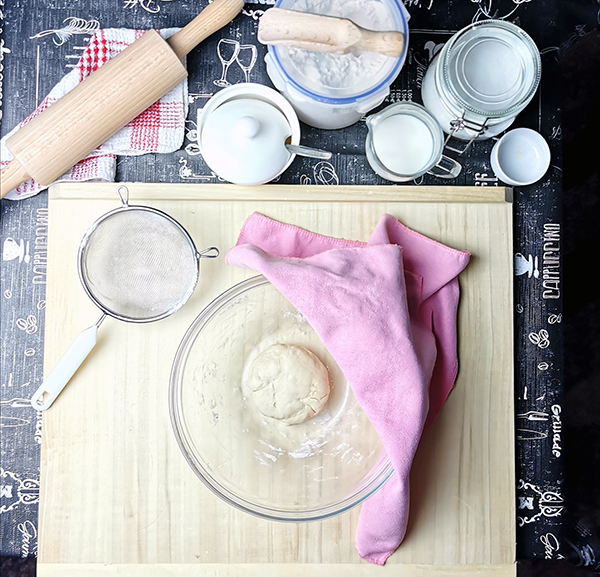4. Wyrośnięte ciasto wyłóż na stolnicę oprószoną wcześniej mąką i ponownie wyrabiaj ciasto, aż będzie elastyczne i gładkie. Przykryj suchą ściereczką i znów pozostaw do wyrośnięcia na 20 minut.