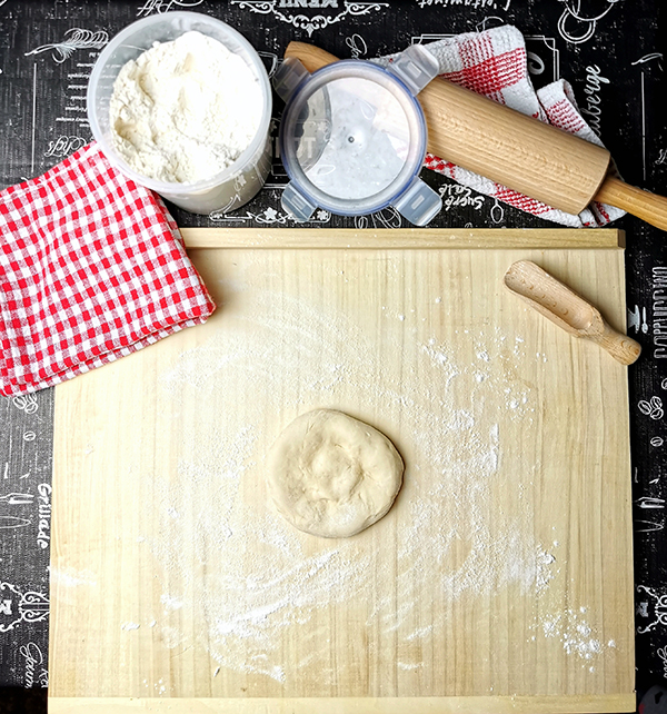 5. Po upływie czasu uformuj z ciasta kulę, a następnie rozwałkuj ciasto na placek o grubości około 1 cm podsypując blat mąką. Ciasto nie powinno przyklejać się do stolnicy.