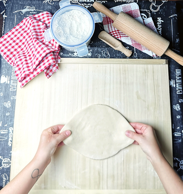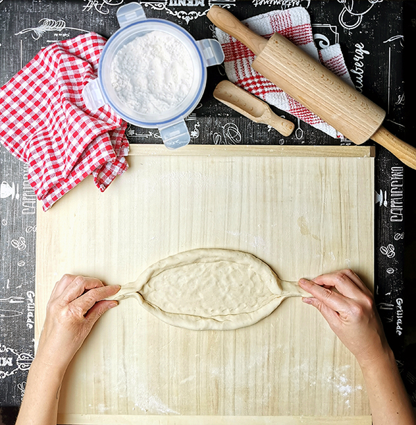 6. Uformowany placek chwyć z dwóch stron i delikatnie naciągnij tak aby przybrał kształt łódki. Następnie okrągłe części zwiń w rulonik, a końcówki zlep ze sobą. Środek możesz jeszcze dodatkowo przyklepać dłonią.