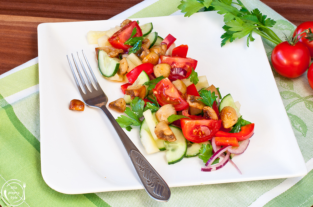 Zimową porą ta sałatka pojawia się dość często u nas na kolację. Chyba przez fakt, że ten okres jakoś najbardziej kojarzy mi się z grzybami.
