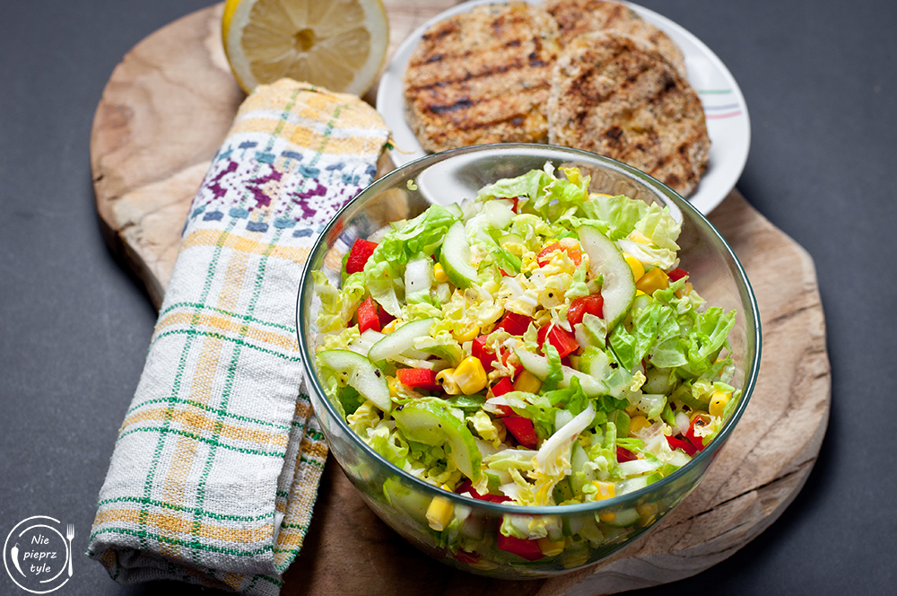 Lubimy ją bo to świetny, chrupiący i soczysty dodatek. Tworzymy z niej różne wersje surówek. Tym razem proponujemy surówkę z kapusty pekińskiej z papryką, ogórkiem i kukurydzą z sosem na bazie oliwy z oliwek.