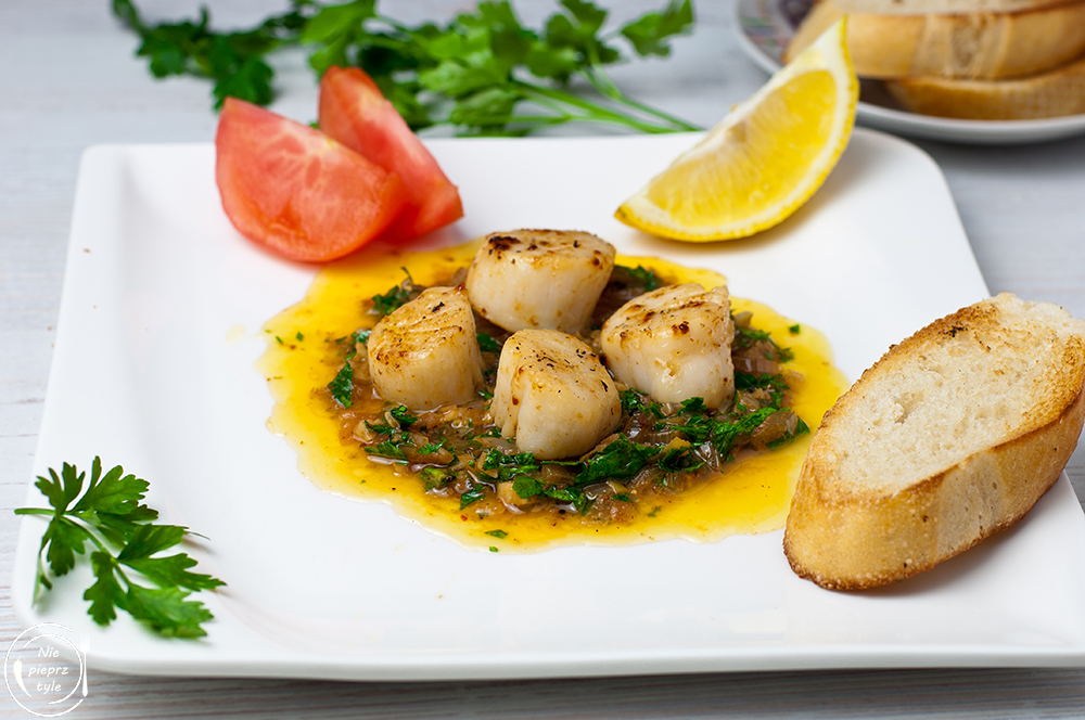 - Na talerz wylej sos, a na nim ułóż przegrzebki. Idealnym dodatkiem do całości będzie ugrillowana/upieczona bagietka oraz cytryna.