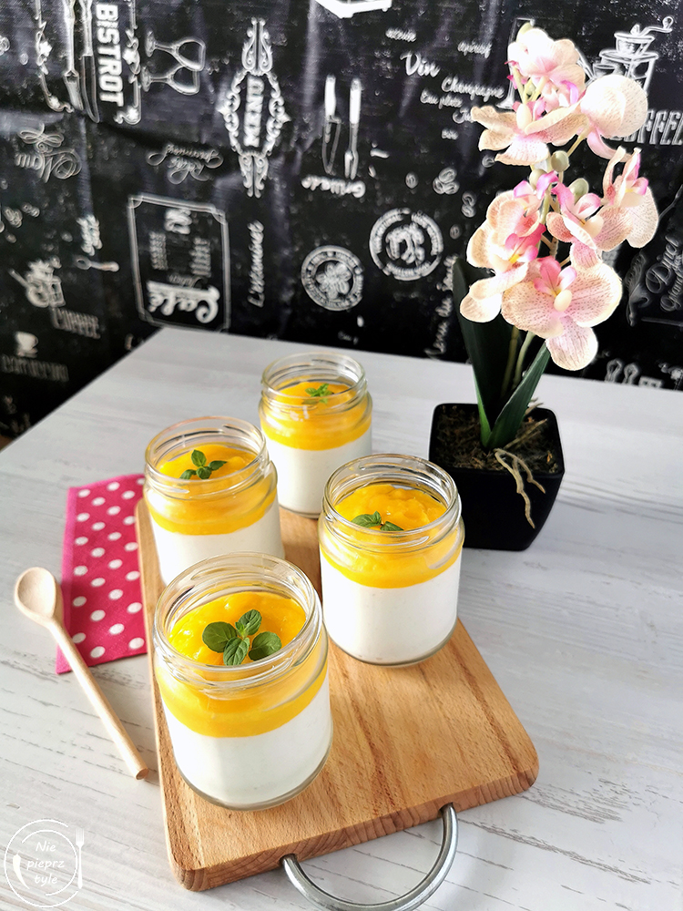 - Przed podaniem przygotuj mus owocowy. Dowolnie wybrany owoc, u nas mango, zmiksuj przy użyciu blendera, a następnie polej deser. Wierzch możesz udekorować listkami mięty lub drobnymi kawałkami owoców. Możesz też na przykład posypać płatkami migdałowymi.