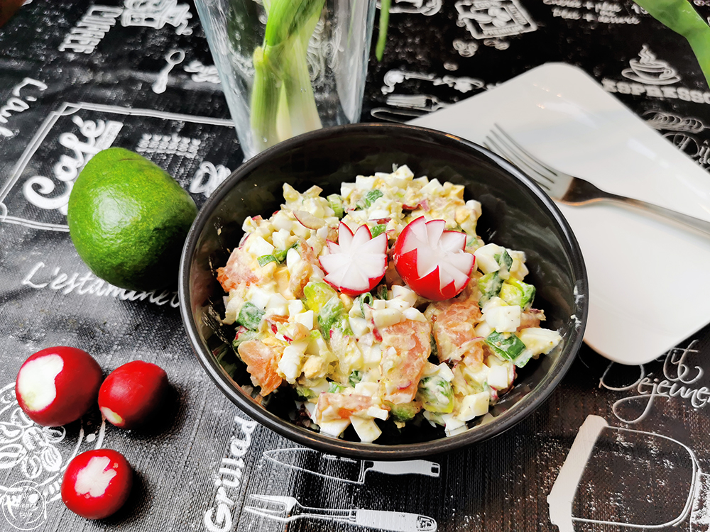 U nas najczęściej pojawiał się na kanapce lub jako składnik do tarty. Tym razem wykorzystaliśmy łososia do przygotowania sałatki.