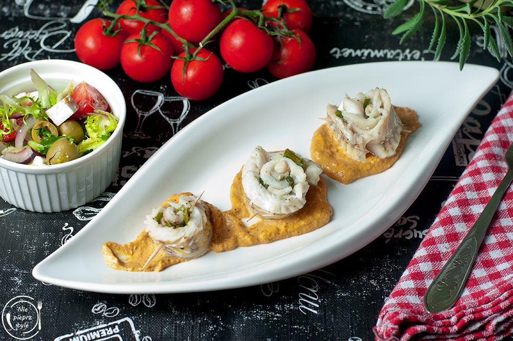 - Zawiń filety w koreczek, a następnie przekłuj je wykałaczką, tak aby trzymały formę.