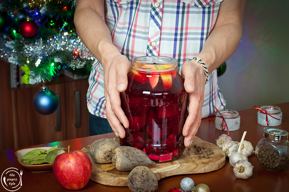 - Na dno słoika włóż wszystkie przyprawy, następnie chrzan, czosnek, jabłko. Na całość ułóż dość ciasno buraki.