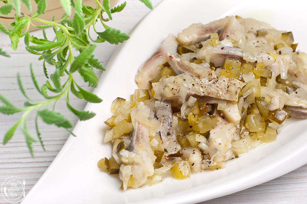 Świetnie się komponuje z różnymi dodatkami. Tym razem dodaliśmy do śledzia cebulę i ogórka kiszonego.