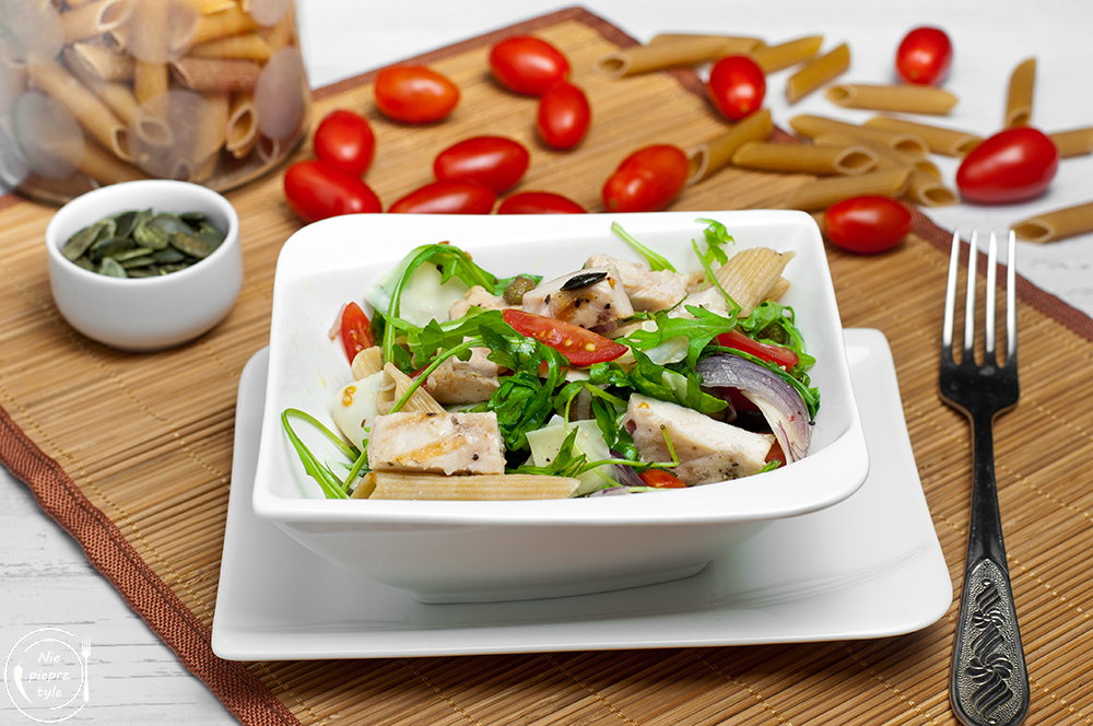 Sałatka makaronowa penne z rukolą, pomidorkami i serem dziugas pojawiła się już u nas w wersji bezmięsnej.