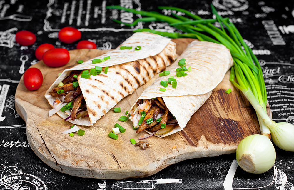 - Wysmaruj tortille majonezem. Wyłóż środek przygotowanym miksem warzywnym zostawiając jedną stronę wolną. Na warzywa połóż porcję podsmażonych boczniaków, a potem polej ketchupem. Złóż wolny kawałek placka tortilli by zamknąć jedną część kebabu. Następnie załóż jeden bok, najlepiej ten od siebie, na składniki i zwiń całość w rulon.