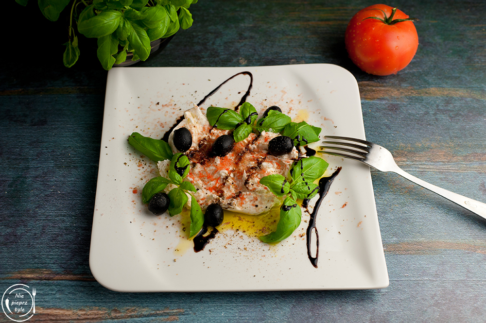 - Burratę udekoruj czarnymi oliwkami i listkami świeżej bazylii.