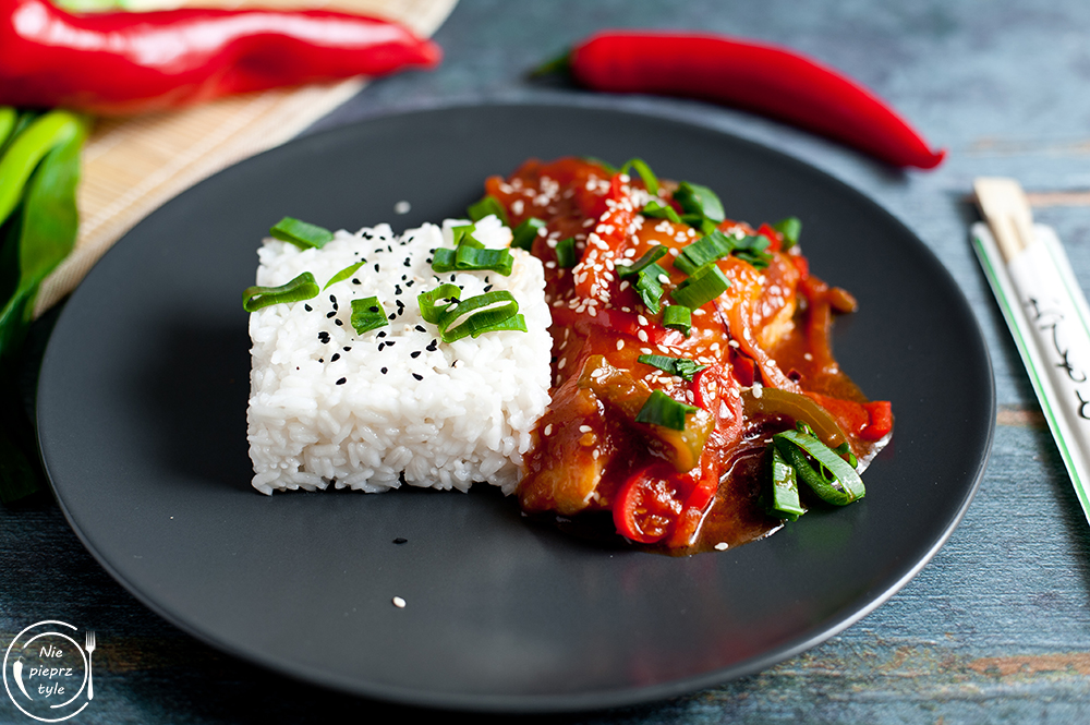 - Danie podawaj z ryżem i grubo krojonym szczypiorem. Możesz posypać sezamem.