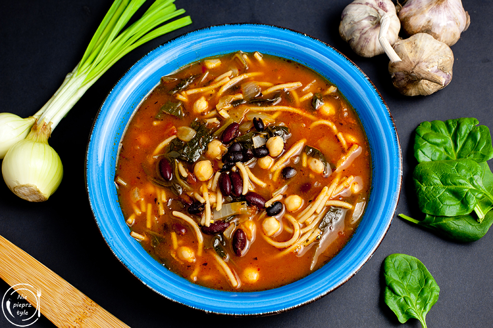 To szybka, sycąca i wegetariańska zupa, którą robi się praktycznie „z jednego garnka”. Ma pomidorową bazę, dużo strączków, trochę makaronu i świeży szpinak, więc jest treściwa i świetnie sprawdza się na obiad albo jako zupa „na zapas”, na kilka dni. Proste składniki, mało roboty, a efekt naprawdę smaczny.